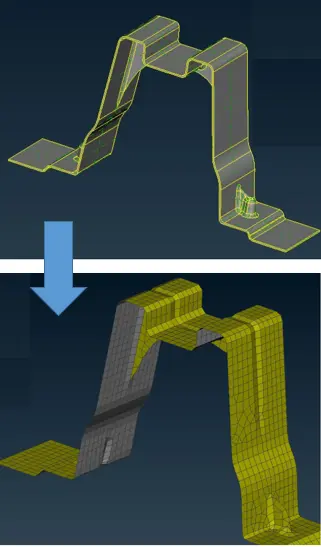 此全自动功能用于创建代表实体中间层的有限元壳单元,该功能适用于铸造零件的中面提取。其功能运行效果如下: