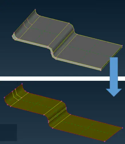 该功能通过识别封闭几何体的外表面或者内表面并对其进行偏移,以某一均匀厚度的中间曲面代替原封闭几何体。该方法适用于冲压零件。其功能运行效果如下: