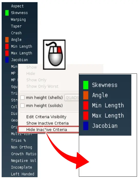 我们也可以在质量标准区域处通过鼠标右键选择隐藏不需要关注的质量类型,让ANSA界面更简洁。