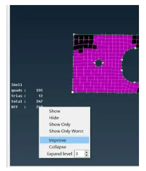 这时,在视图区域的左下角,显示了所有界面上可见的外壳和实体单元的数量(每种类型和总计数量)。此外,在同一列表中,我们可以获得有关网格区域的信息。通过鼠标右键菜单中的选项,我们可以控制这些区域的可见性,也可以通过选择“Improve”选项来对它们进行网格优化。