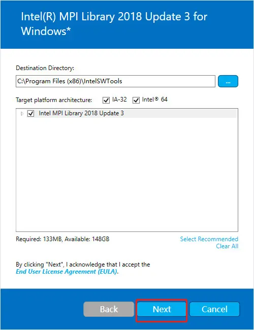 4、选择install intel MPI,(这里根据自己的处理器类型进行选择,本电脑选用的intel处理器,IBM处理器就选择IBM)