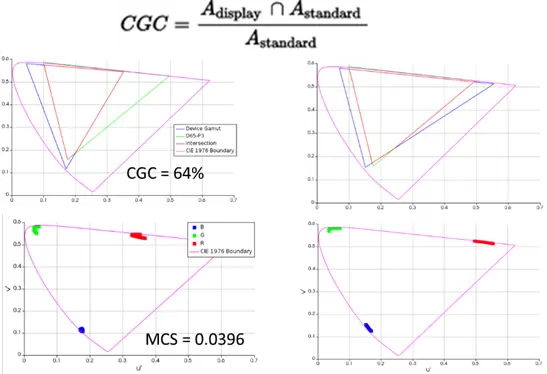 在设计显示屏时,定量的方法描述颜色是非常重要的,可以通过颜色空间进行几何处理,展示在CIE 1976颜色空间中的色度图,将光的实际状态与视觉感知联系起来。使用红色、蓝色和绿色作为原色,将它们混合在一起,可以在所谓的设备色域内产生白色和任何其他颜色。因此我们希望RGB的尽可能接近色度图边界颜色,换言之完全单色,实现最宽的色域,色域覆盖率CGC,同时我们需要高效的光提取,我们称之为外部量子效率或EQE,并且从宽视角下也能清晰的显示颜色的准确性,准确描述颜色随观察角度的变化,我们称之为最大颜色偏移MCS。因此在STACK设计改变发射腔不同层结构的厚度,将会得到不同的色域和色偏结果,我们希望在色域和色偏之间找到合适的平衡,同时保证出光效率。