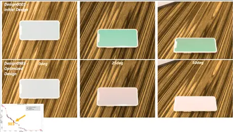 在第二排是从optiSLang获得的第一个优化设计。在正常入射时开始呈白色,当增大入射角时,它看起来像暖白色,几乎是红色,同样的另外两个优化设计。可以看到类似的趋势,但不同的颜色外观。
