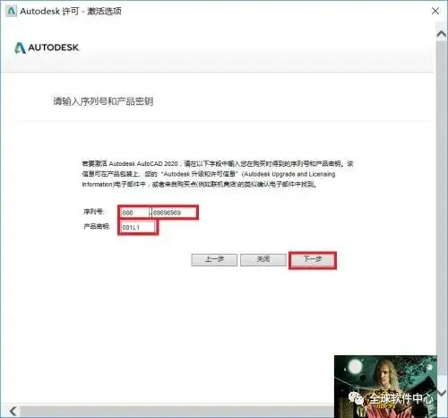 点击输入序列号,激活CAD2020 。序列号:666-69696969密匙:001L1。