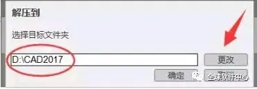 点击更改,选择解压目标文件夹,可在D盘或其它盘里面新建一个CAD2017文件夹,然后点击确定(大概需要3分钟左右)。注意不要选择C盘(因为文件过大)
