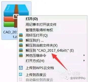 先下载安装包,下载完成后右击软件安装包,选择解压到CAD_2017_64bit,自动生成CAD_2017_64bit文件夹