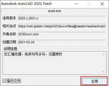 第三步、在AutoCAD 2023 中文版破解补丁程序左下角选择“备份文件”,然后点“应用”,AutoCAD 2023 中文版破解补丁会自动完成AutoCAD 2023 中文版的破解。