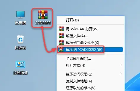 1.鼠标右击【CAD2023】压缩包(Win11系统需先点击“显示更多选项”)选择【解压到 CAD2023】。