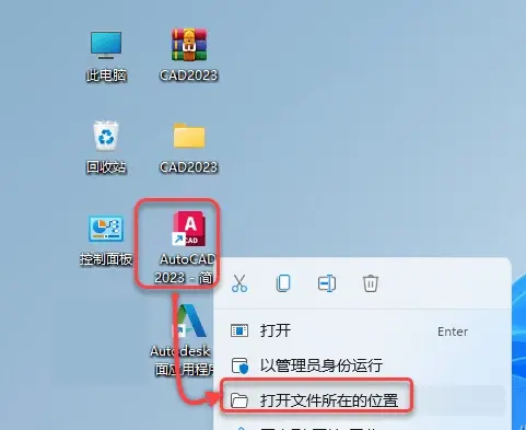 12.鼠标右击桌面【AutoCAD2023……】图标选择【打开文件所在的位置】。