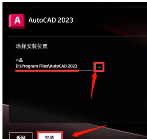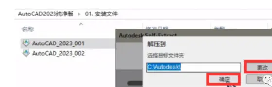 3、打开安装文件夹,运行【AutoCAD_2023_001】,设置解压位置(一般选择C盘以外其他盘),再点击确定。