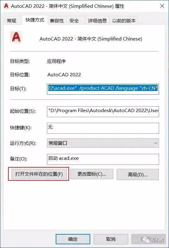 在弹出来的对话框中选择打开文件所在的位置,就可以定位到CAD 2022的安装目录了。