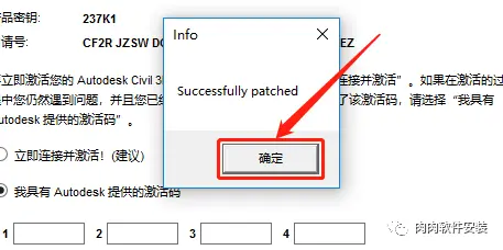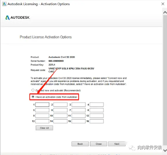29.全部选中Activation中生成的激活码(仔细检查是否复制完整),使用Ctrl+C键或者鼠标右击复制生成的激活码,然后粘贴激活码至我具有Autodesk提供的激活码方框中,最后点击下一步。