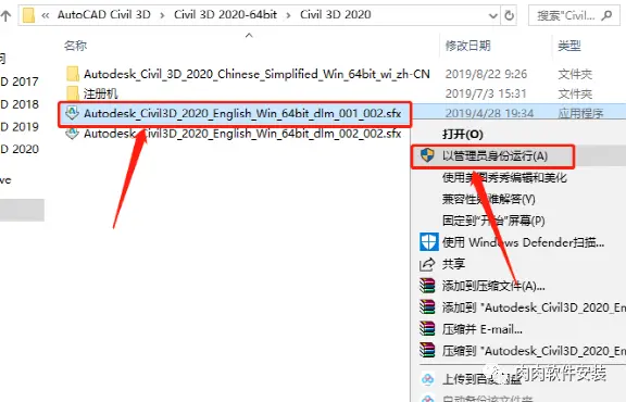4.鼠标右击【Autodesk_Civil3D_2020_English_Win_64bit_dlm_001_002.sfx】安装程序,选择【以管理员身份运行】。