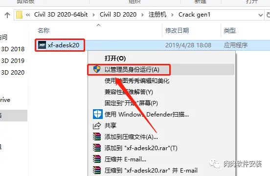 24.选中【xf-adesk20】注册机,鼠标右击选择【以管理员身份运行】。