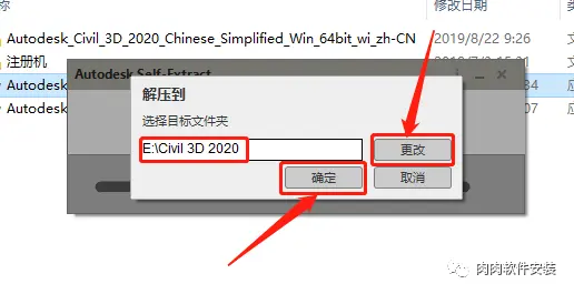 5.点击【更改】设置软件的解压路径,建议解压到除C盘以外的磁盘,可在E盘或其他盘新建一个【Civil 3D 2020】文件夹,设置好解压路径后点击【确定】。