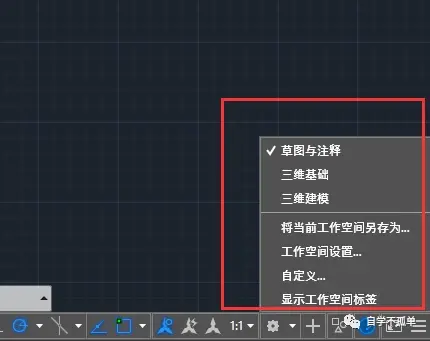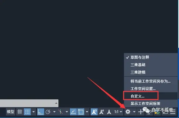 1、首先点击CAD软件右下角的设置小齿轮,这里可以切换CAD的不同界面,2015以下版本可以直接选择AutoCAD 经典进行切换,但是CAD 2015以上版本经典模式已经取消 ,无法这接选择切换。只能选择自定义进行设置。