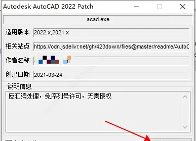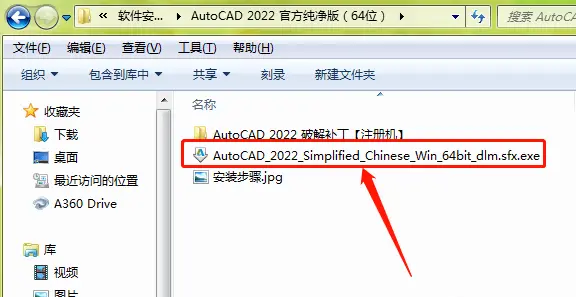 2、下载解压,得到CAD2022中文版和相对应的激活文件,双击“AutoCAD_2022_Simplified_Chinese_Win_64bit_dlm.sfx.exe”开始安装原程序;