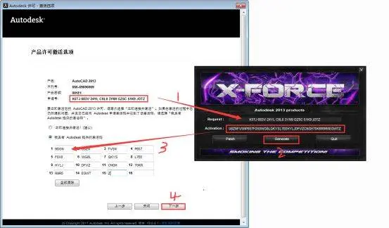 17、按如图所示步骤,先将申请号复制到注册机里面,然后点击generate生成激活码,将生成的激活码再复制到左边激活码栏,最后点击下一步