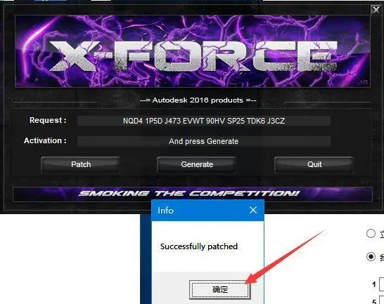 复制“申请号”粘贴到注册机第一个框框,然后点击第一个按钮,弹出一个成功对话框后,点击第二个按钮,这里在第二个框框生成的就是激活码,复制激活码粘贴到CAD激活界面的激活码输入框,点击”下一步“即可。