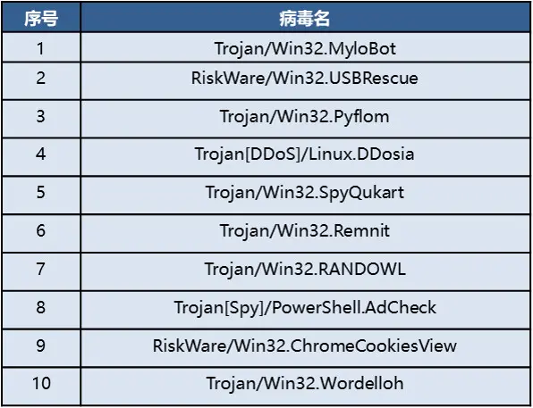 下表为新增可检的恶意代码家族TOP10清单: