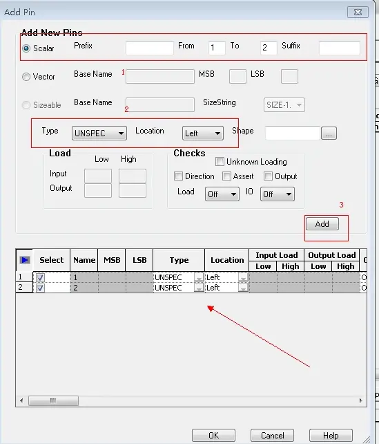6)添加逻辑管脚:package pin – pins-add(其他选项说明:global modify引脚属性修改、global rename引脚重命名、global delete引脚删除),