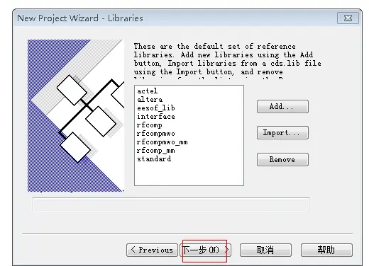3)添加cadence自带的库(可以不添加),点击下一步,再点击完成