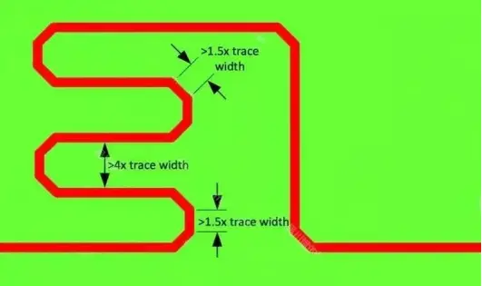 除了射频信号和其他有特殊要求的信号,我们PCB上的走线应该优选以45°走线。要注意一点的是,45°角走线绕等长时,拐角处的走线长度要至少为1.5倍线宽,绕等长的线与线之间的间距要至少4倍线宽的距离。