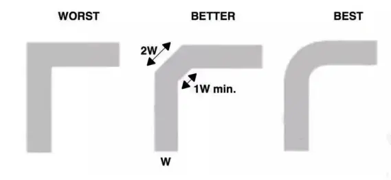 现在但凡打开SoC原厂的pcb Layout Guide,都会提及到高速信号的走线的拐角角度问题,都会说高速信号不要以直角走线,要以45°角走线,并且会说走圆弧会比45°拐角更好。