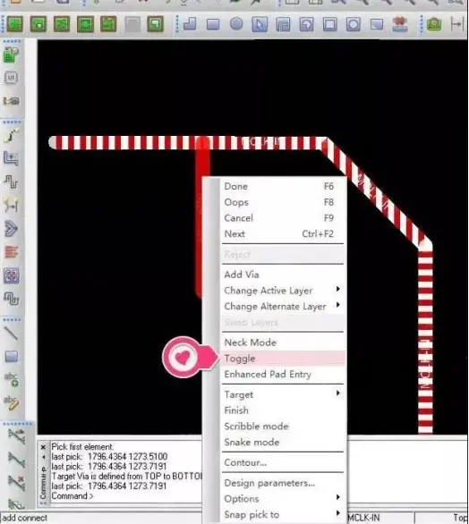 灵活应用Cadence Allegro布线时切换”toggle“选项,可以避免导线拉出T型分支时形成锐角夹角,避免造成“acid traps”DFM问题。