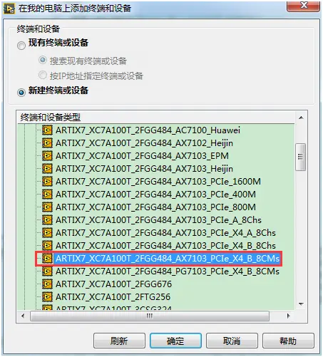 然后在弹出来的终端设备新建对话框里面,找到ARTIX7-100T对应的X4模式下包含2通道Memory和8通道FIFO的B版本FPGA终端,如图7-59所示。