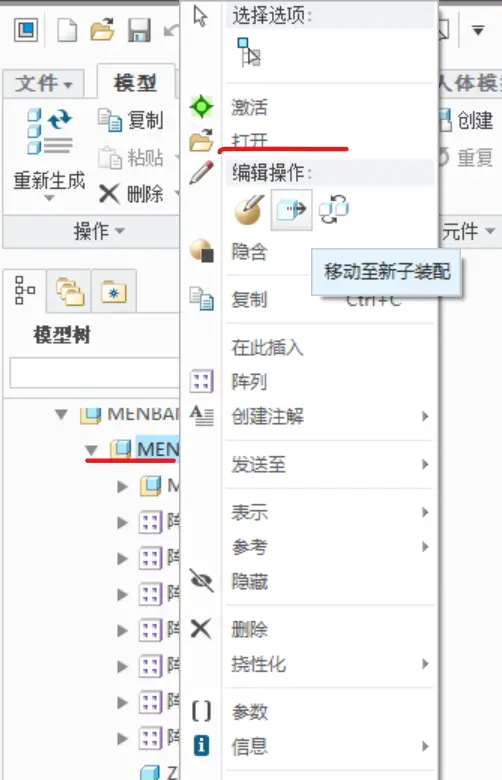 选中某个器件,长按右键,在模型树定位,点击文件,打开