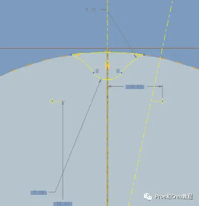 (4)从RIGHT面作一直线,相对TOP面标注直径尺寸为8.7(尺寸代号SD16),作一圆与此直线相切,圆心横坐标距齿顶圆与TOP面的交点7.9(尺寸代号SD17),标注此圆半径为16.9(尺寸代号SD18),过此交点作一垂直线与圆弧相交,点击“动态修剪切面图元”,修剪保留轮廓。点击“选取项目”,选择修剪好的图元,点击“镜像”,选取依附于TOP面的中心线为镜像中心线。