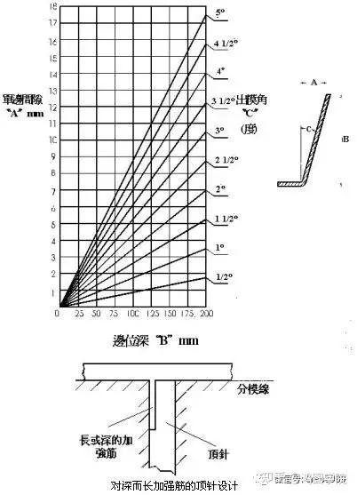 出模角的大小是没有一定的准则,多数是凭经验和依照产品的深度来决定。此外,成型的方式,壁厚和塑料的选择也在考虑之列。一般来说,高度抛光的外壁可使用 1/8 度或 1/4 度的出模角。深入或附有织纹的产品要求出模角作相应的增加,习惯上 每 0.025mm 深的织纹,便需要额外 1 度的出模角。出模角度与单边间隙和边位深度之关系表,列出出模角度与单边间隙的关系,可作为叁考之用。此外,当产品需要长而深的筋及较小的出模角时,顶针的设计须有特别的处理,见对深而长加强筋的顶针设计图。出模角度与单边间隙和边位深度之关系表