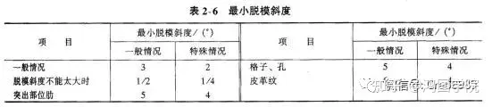 型芯的拔模斜度应大于型腔。6 .最小拔模斜度(表 2-6 )拔模斜度影响制品的脱出情况。如果拔模斜度很小,拔模阻力增大,顶出机构就会失去作用。在一般情况下,不能小于最小拔模斜度,以防止制品留模。