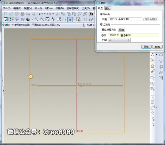 2. 选择TOP面作为草绘面,RIGHT面作为右参照绘制草绘