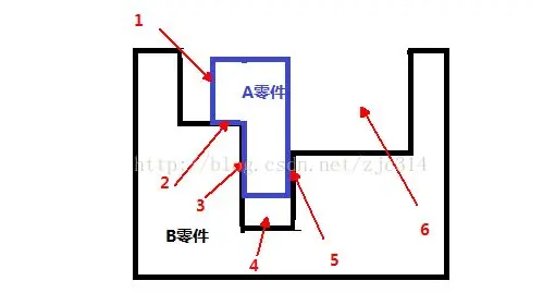 寻找零件A的面与零件B的面的间隙(不要管间隙有多大),可知A零件的装配间隙有6个;