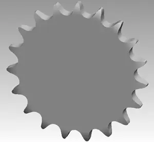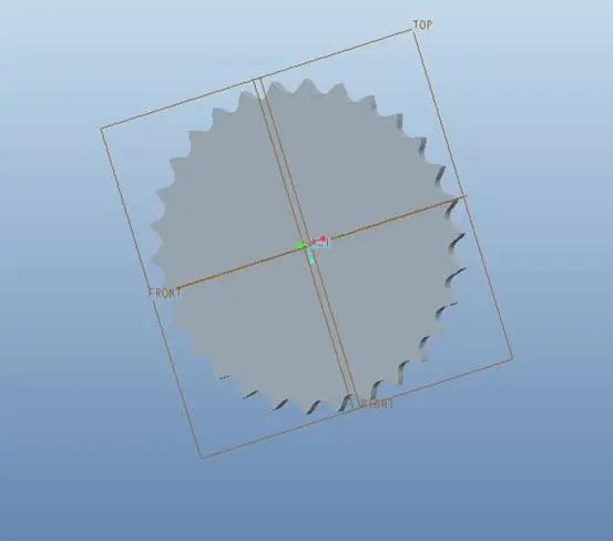 6.创建链轮主体 (1)单击“旋转”选择FRONT面作为草绘平面,参照平面为TOP面。 (2)进入草绘界面,选择RIGHT面、TOP面和齿顶圆与TOP面的交点为参照。 (3)点击“两点中心线”,选择TOP面为中心线依附面,再次点击“两点中心线”,选择RIGHT面&中心线依附面。 (4)从RIGHT面作一直线,相对TOP面标注直径尺寸为8.7(尺寸代号SD16),作一圆与此直线相切,圆心横坐标距齿顶圆与TOP面的交点7.9(尺寸代号SD17),标注此圆半径为16.9(尺寸代号SD18),过此交点作一垂直线与圆弧相交,点击“动态修剪切面图元”,&剪保留轮廓。点击“选取项目”,选择修剪好的图元,点击“镜像”,选取依附于TOP面的中心线为镜像中心线。 (5)单击“工具”下拉菜单选择“关系”,打开关系式窗口,加入如下关系: SD16=B(链轮机体厚度) SD17=H(齿高) SD18=R4(轴向齿廓半&) 完成草绘,退出草绘界面,点击“确定”完成[旋转]特征。 7.创建第一个齿隙 (1)点击“拉伸”,在快捷菜单中选择“去处材料”,选择TOP面作为草绘平面,参照平面为FRONT面 (2)进入草绘界面,选取渐开线曲线及轮体轮廓线作为参照。 (3)点击“两点中心线”,选择FRONT面为中心线依附面。 (4)点击“通过边创建图元”,选取渐开线曲线及与之相交的轮体轮廓线,通过“动态修剪切面图元”修剪去除不必要的图元,点击“镜像”,选取依附于FRONT面的中心线为镜像中心线。 (5)完成草绘,退出草绘界面,深度选择“拉伸至与所有平面相交”,点击“确定”完成“拉伸”特征。 8.阵列齿隙 (1)点击“复制”上述齿隙特征,点击“选择性粘贴”,选择“对副本应用移动/旋转变换”,在快捷菜单中选取旋转,选择中心轴作为转轴,输入18.9(尺寸代号D198)作为转角角度。完成后如图5所示。完成后打开“关系”及“程序”,加入如下关系式,以建立阵列特征数与齿数之间的联系。D198=360/(P2+1)