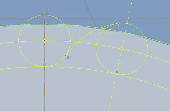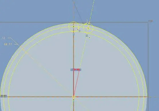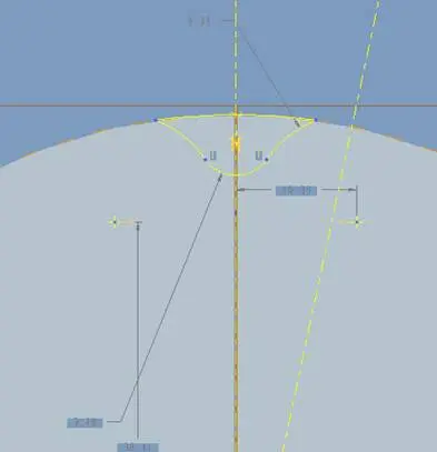 (3)单击“工具”下拉菜单选择“关系”,打开关系式窗口,加入如下关系: D1=dedentum_dia(齿根圆直径) D2=pitch_dia(分度圆直径) D3=addendum_dia(齿顶圆直径) (4)单击“确定”结束输入。 (5)单击“更新”?坂“当前值”,系统将按照关系式计算这三条曲线。 5.虢ú问化渐开线曲线 (1)单击“草绘工具”,选择“草绘平面”为TOP面,草绘参照为FRONT面。 (2)进入草绘界面后,选择pitch_dia(分度圆直径)曲线及addendum_dia(齿顶圆直径)作为参照。 (3)作一条辅助线过分度圆与FRONT面的交点,以此为中心作半径为5.16(尺寸代号SD9)的圆;辅助线与FRONT面之间所形成夹角的度数标注为51.84(尺寸代号SD10);作一圆,标其与FRONT面的纵向距离为13.03(尺寸代号SD11),与半径为5.16的圆的圆心的横向距离(靠左)为2.17(尺寸代号SD12),标此圆半径为7.40(尺寸代号SD13);作圆与之前两圆相切,半径为13.28(尺寸代号SD14)。 (4)单击“工具”下拉菜单选择“关系”,打开关系式窗口,加入如下关系: SD9=R1(齿沟圆弧半径) SD10=ALFHA(二分之一齿沟角) SD11=W(齿宽) SD12=V(两段圆弧圆心之间的横向距离) SD13=R3(第三段圆弧的半径) SD14=R2(第二段圆弧的半径) (5)对草绘曲线进行剪切处理,修剪保留“三圆弧一直线”。 (6)完成后渐开线如图4所示:
