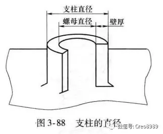 一般来说,螺母周围塑胶材料的厚度为螺母外径的1/2〜1倍。如果螺母埋入支柱中,支柱的直径应至少是螺母直径的2倍,如图3-88所示。