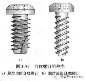 自攻螺钉(Self-tapping Screw)包括螺纹切削自攻螺钉(Thread-cutting Screw)和螺致成形自攻螺钉(Thread-forming Screw),如图3-83所示。