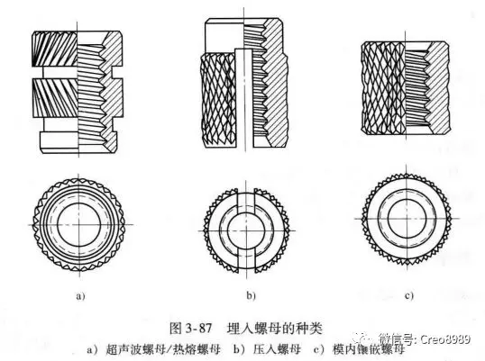 当塑胶件需要多次拆卸时,使用自攻螺钉不是一个最佳选择,此时可以选择在塑胶件中埋入螺母,然后再使用螺钉固定。当然,埋入螺母的成本较高。根据埋人螺母的安装方式,埋入螺母可分为超声波螺母/热熔螺母、压入螺母、模内镶嵌螺母,如图3-87所示。