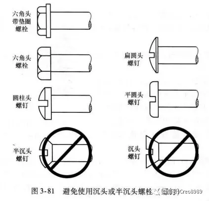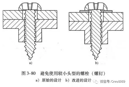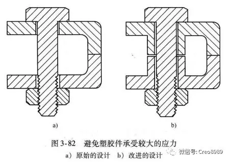 使用较大头型的螺栓(螺钉)、有肩螺栓或者使用垫圈来扩大塑胶件与紧固件的接触区域,从而减小塑胶件承受的压应力,如图3-80所示。