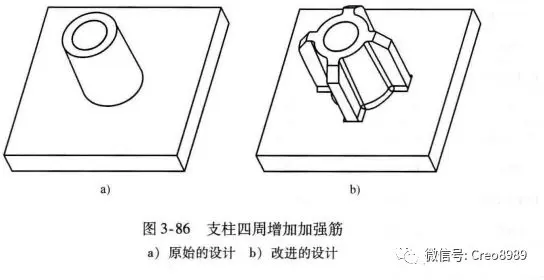 自攻螺钉支柱最常见的失效模式是支柱不能承受自攻螺钉旋入过程中的圆周力而发生破裂,因此在支柱四周增加加强筋就非常必要。同时也应当在支柱与加强筋的连接处、支柱与主壁连接处增加一定的圆角以避免应力集中,提高支柱的强度,如图3-86所示。