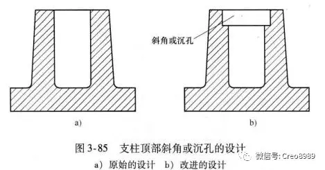 支柱顶部应当增加斜角或沉孔,如图3-85所示。斜角或沉孔具有导向作用,使得自攻螺钉拧入过程顺利,同时为塑胶屑提供空间,防止塑胶屑溢出,沉孔的尺寸可以参考图3-84。