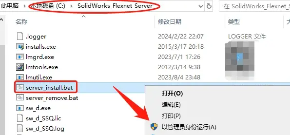 2、进入“激活文件”目录,复制SolidWorks_Flexnet_Server文件夹,粘贴到C盘根目录,并以管理员身份运行“server_install.bat”文件,成功后,点击关闭!