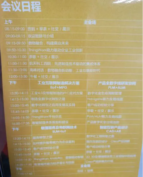 大课上主要说明,数字世界和物理世界通过3D打印、智能制造、IOT及其分析、AR、VR相互连接。然后介绍其产品thingworx——专门针对工业创新、快速轻松开发部署扩展、灵活性、生态系统,在智能互联产品、智能制造、数字系统业务流程、零售创新、增强现实、智慧城市六个方面提供帮助。在产品全生命周期均有应用——设计、制造、销售、服务、培训、运营。另一个产品creo主要用于产品设计——验证设计需求、减少对物理原型的依赖、优化传感器的使用,其产品经理着重介绍了他们使用creo在赛车设计上的应用,将传感器装在真实的赛车上采集数据,将数据以颜色或者可视向量的形式叠加在仿真模型或者用AR叠加在真实视频上实时观察赛车各个部位的传感器采集的数据情况。最终赛车设计师根据这个展示优化了赛车结构。(有点像某些桥梁建造的游戏中那种实时显示桥梁部件受力情况得到功能)。上午最后是一个谈话,话题是数物融合新动能,工业互联新时代。简单讲了下各位嘉宾对推动数物融合的力量和工业互联的概念理解。有的说是供应商的推动,有的附和是是是。有的说工业互联和智能制造和工业四点零之类的概念是一样的。有的附和工业互联网和工业物联网也是一样的。哎,说真的现在的智能制造不是有政府前几年的两化融合的基础加上现在相关技术成熟和人口老龄化对其的需求?强行拉上供应商说事只能理解成供应商不降价,消费者买不起贵的,渠道商成本也难降,只能从制造入手了?反正不是很懂,想必国家指导我们这些懵懵娃子也很头疼吧。
