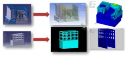 建筑和结构设计人员根据工程布置方案,在VPM平台上同步进行BIM设计,并将需要计算的三维模型导入ANSYS软件中,进行结构的三维有限元计算。利用BIM模型导入Simulation CFD中完成计算流体动力学(Computational Fluid Dynamics, CFD)的数据模拟,完成副厂房会议室的气流组织模拟,减少常规计算工作。如图8所示。