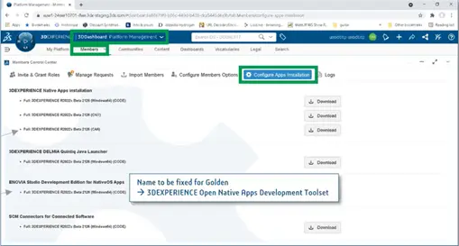 利用平台管理员(Platform Administrator)账户登录云平台,可以在3DDashboard的Platform Management->Member->Configure Apps Installation面板下载CAA API和开发工具对应的GA介质。可能未来随着平台版本升级,介质下载位置会有适当的改变。
