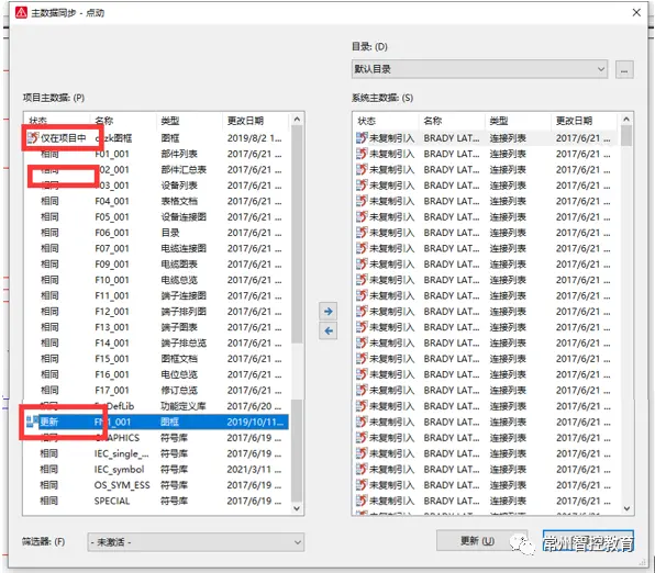 选择项目模板建立一个Eplan项目后,软件会选择符合项目模板标准的符号库、图框、表格等系统主数据复制到项目数据中,如果有一个项目中的项目数据和系统主数据有不一样的符号、图框、表格等数据时,可以通过工具—主数据—同步主数据功能,将不同数据同步到系统主数据中。