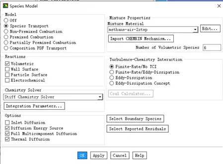 然后设置湍流模型和燃烧模型;湍流常用的是双方程模型k-e和k-w以及大涡模拟;燃烧常用的是组分输运、预混燃烧和综合PDF;可以选用标准ke以及标准壁面函数,湍流OPTION都没勾选;